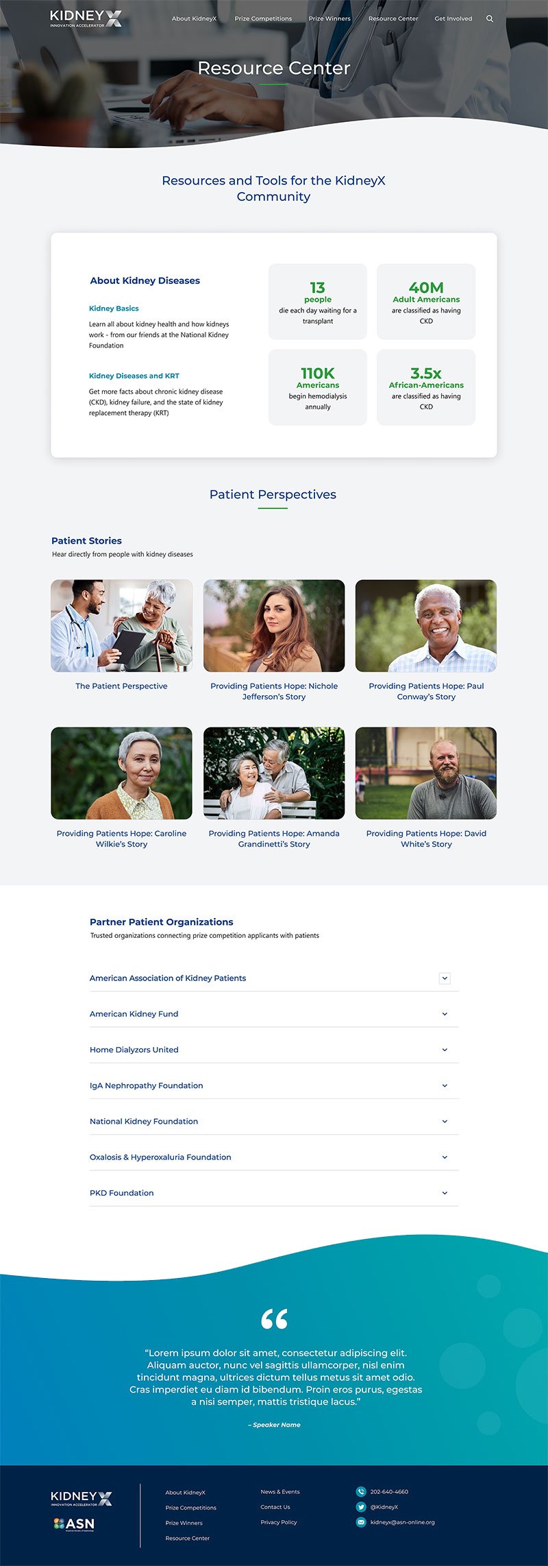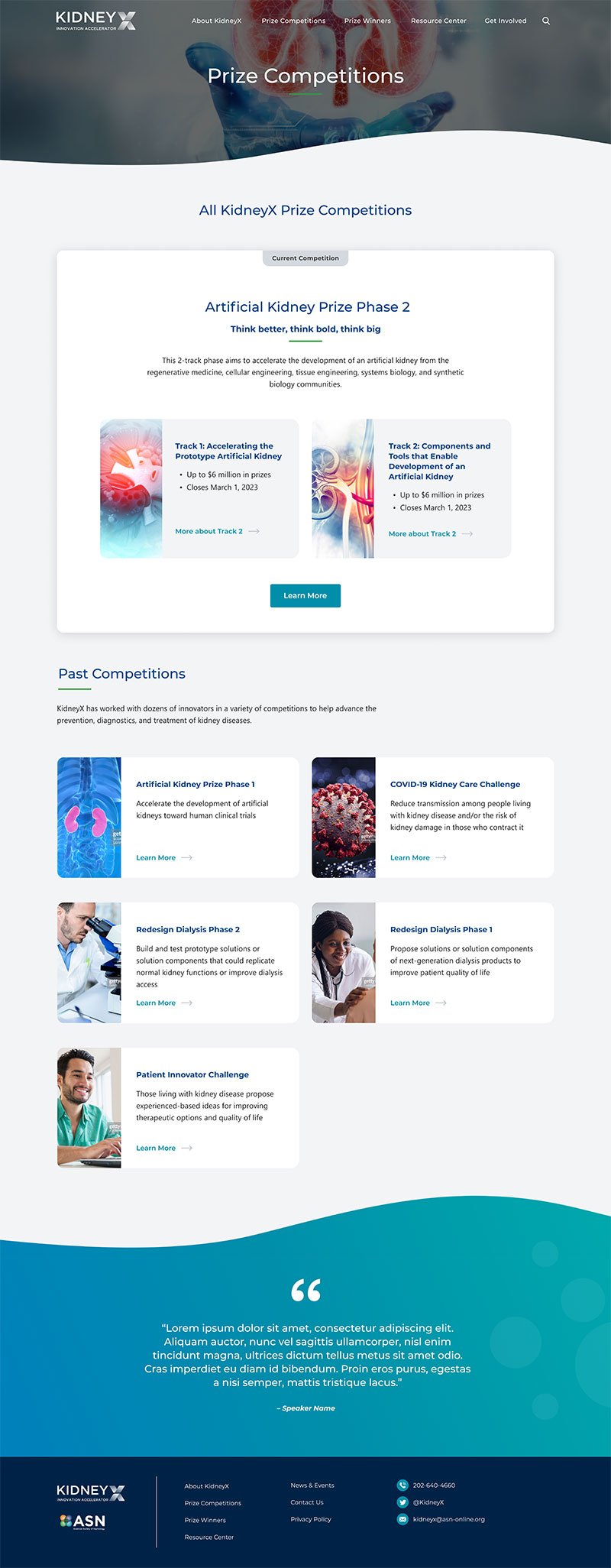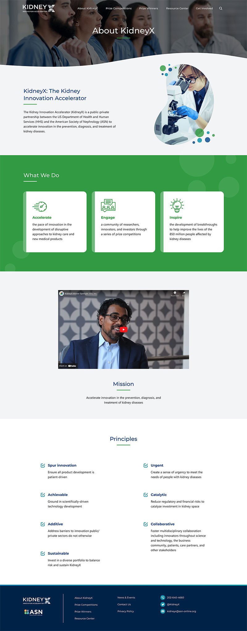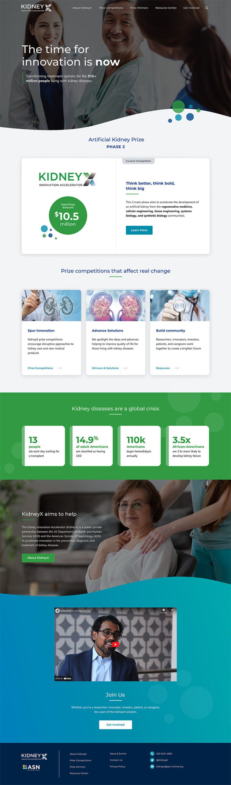 Website redesign for the KidneyX Innovation Accelerator, a public-private partnership between the US Department of Health and Human Services (HHS) and the American Society of Nephrology (ASN) to accelerate innovation in the prevention, diagnosis, and treatment of kidney diseases.