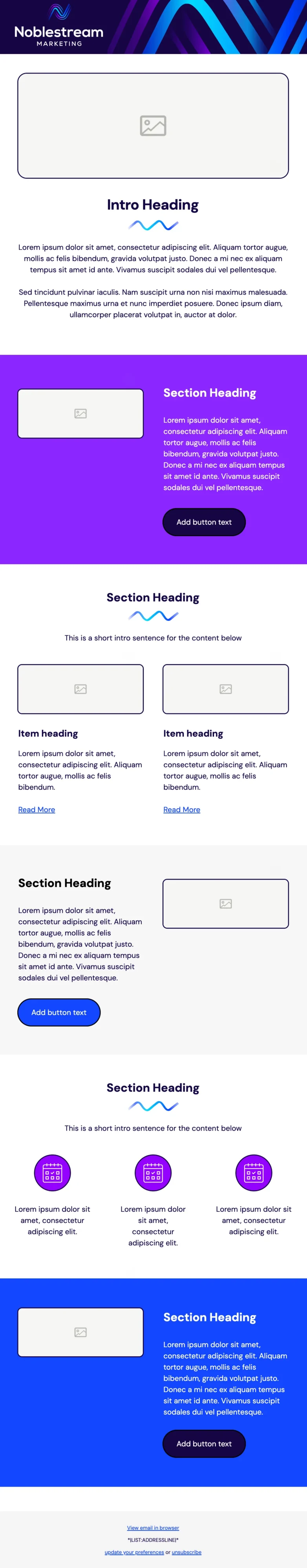 As part of a complete rebrand for Noblestream Marketing, I created a flexible email template in Mailchimp with modular sections that could be easily customized by the marketing team. The design ensured consistency with the new brand identity while making it simple for team members to build campaigns.