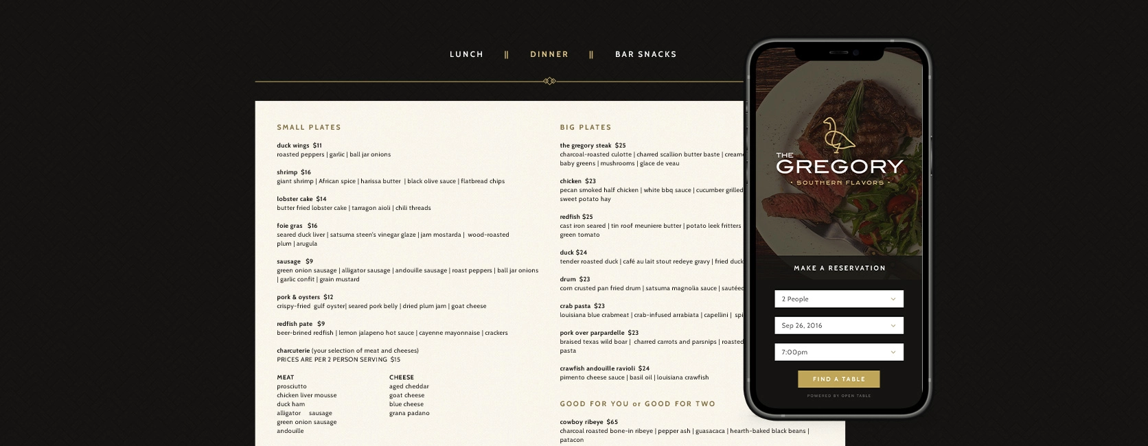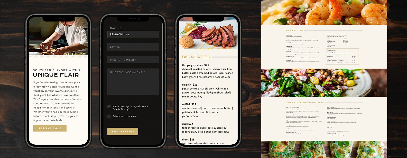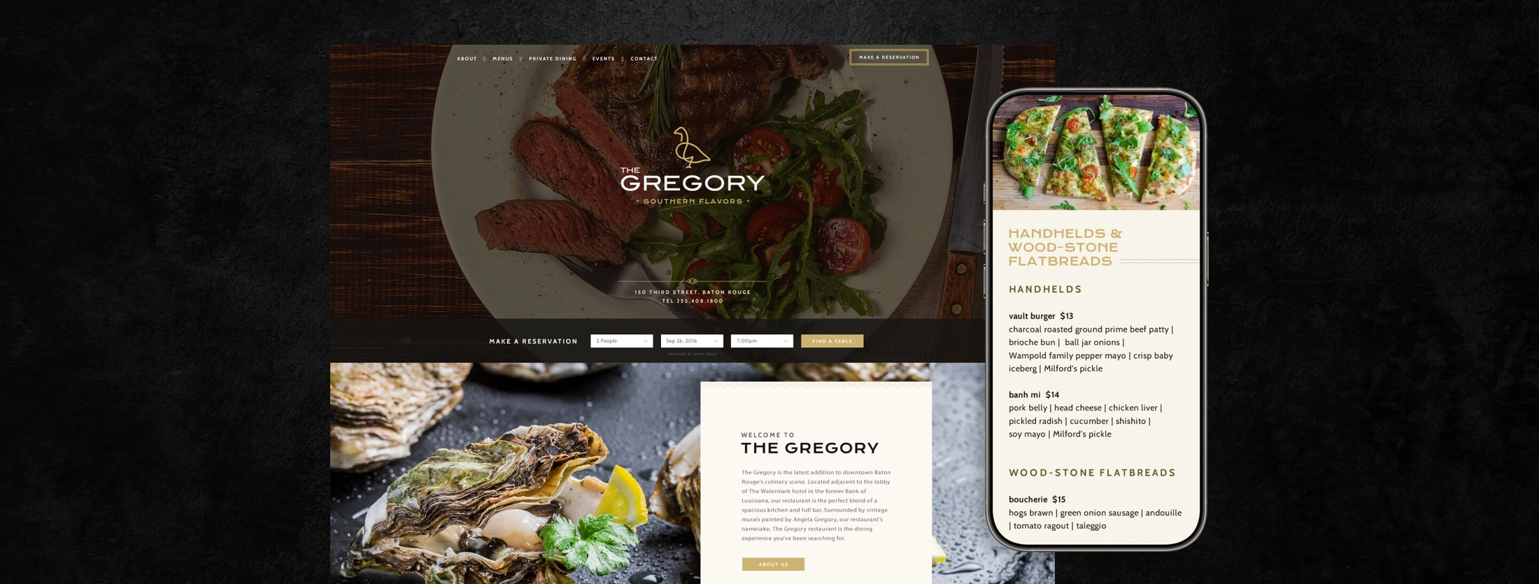 Web designs created for The Gregory, a restaurant with southern flair and art deco vibes in Baton Rouge.